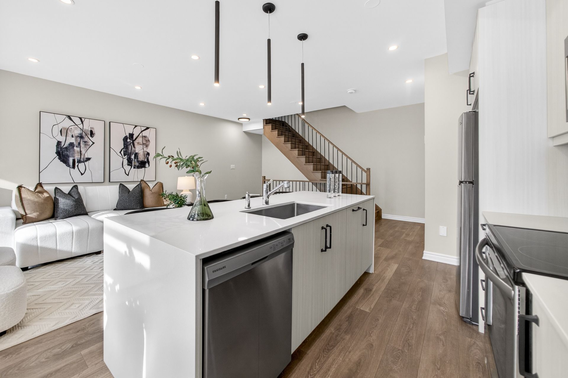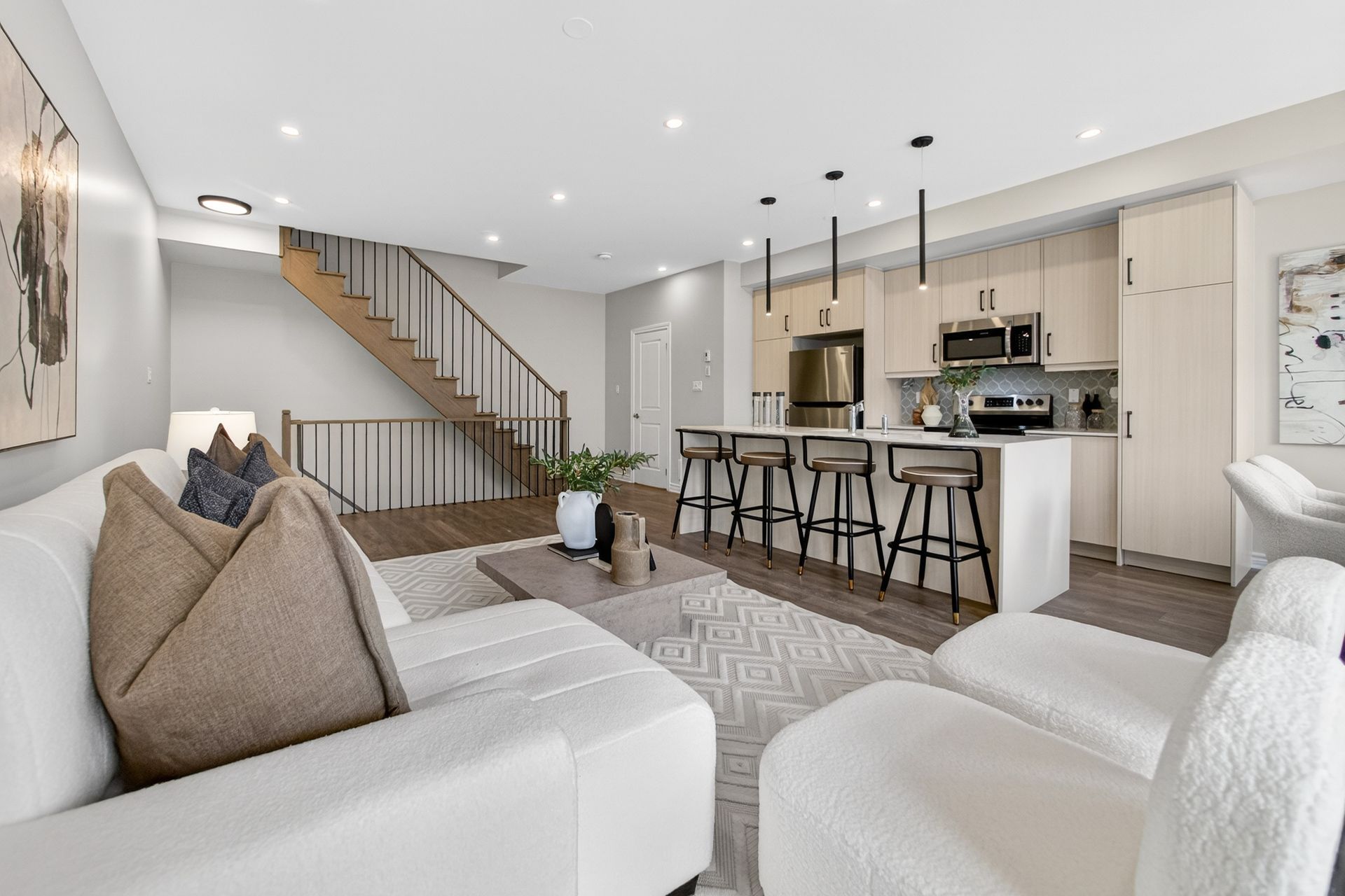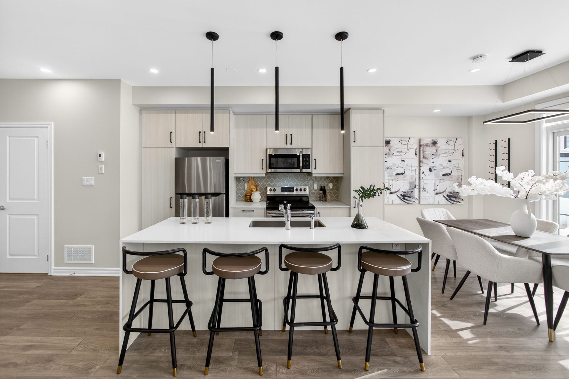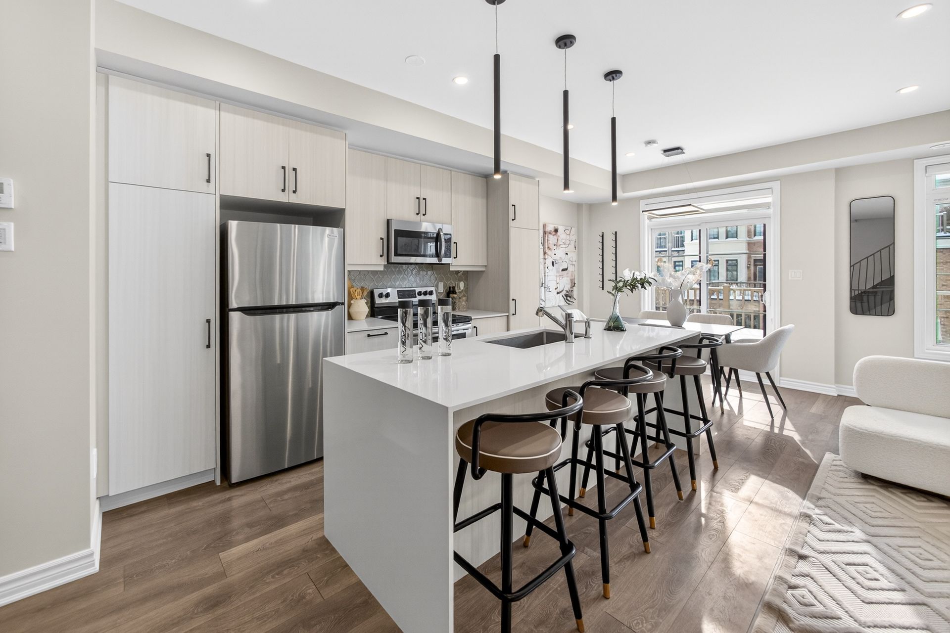 This stunning freehold three-storey townhome in Milton, built by the award-winning Great Gulf, offers a luxury open-concept layout with premium upgrades across all levels. The home features 9-foot ceilings on the main, second, and third floors, creating an airy and spacious atmosphere. Premium Kitchen with upgraded soft-close cabinet , quartz countertop with a waterfall edge, glass backsplash, and designer pendant lighting. Modern Flooring & Finishes: Laminate flooring is found throughout the home, complemented by hardwood stairs with iron pickets. The entire interior has been professionally painted. New Pot lights contribute to a luxurious look by offering a sleek, unobtrusive design that provides versatile, high-quality illumination , Smooth Ceiling for a Neat Look. Spacious Bedrooms & Baths. Both bedrooms are sized to accommodate King and Queen beds. The three upgraded washrooms feature high-ceiling mirrors, Quartz Counter Tops and glass enclosures for both the master ensuite and the second bathroom . Modern Window Rollers . The property includes three-car parking with no sidewalk and features balconies on both the second and third levels. Entrance to Home from garage and Garage opener for Easy Daily Access .Located in the visionary master-planned community of Milton Village, the home is positioned near Hwy 25 and Britannia Road. Conveniently close to the Milton GO Station and Highways 401 and 407 and Minutes away from Rattlesnake Point and Kelso Conservation Area